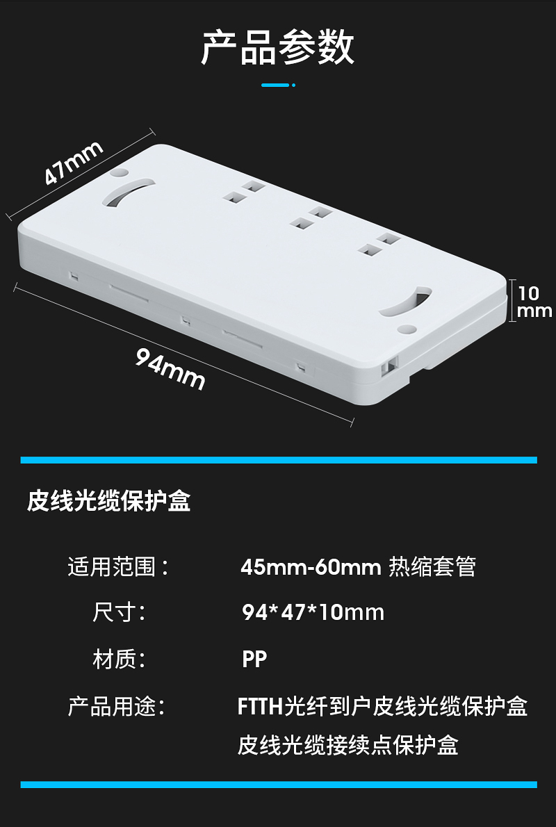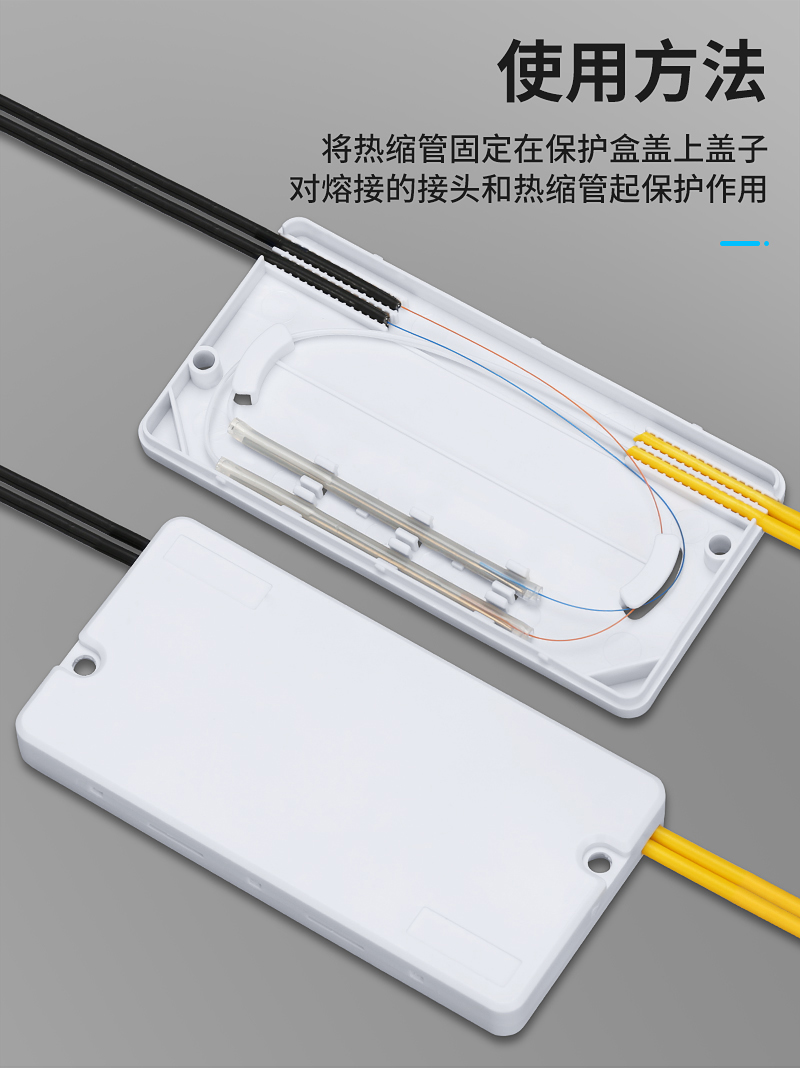 产品名称: 热缩管熔接头保护盒 皮线光缆接头保护盒 二进二出皮线光纤保护盒