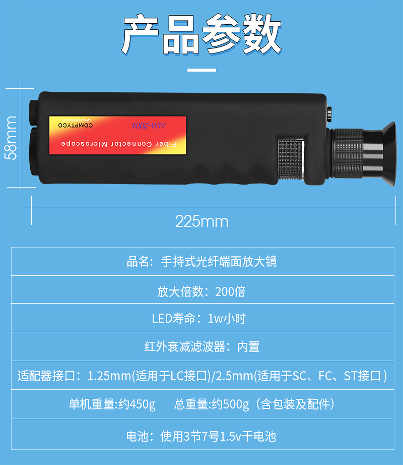 产品名称:COMPTYCO 康普泰光纤端面检测仪AUA-200X手持式光纤显微镜光纤放大镜200倍SC FC ST LC