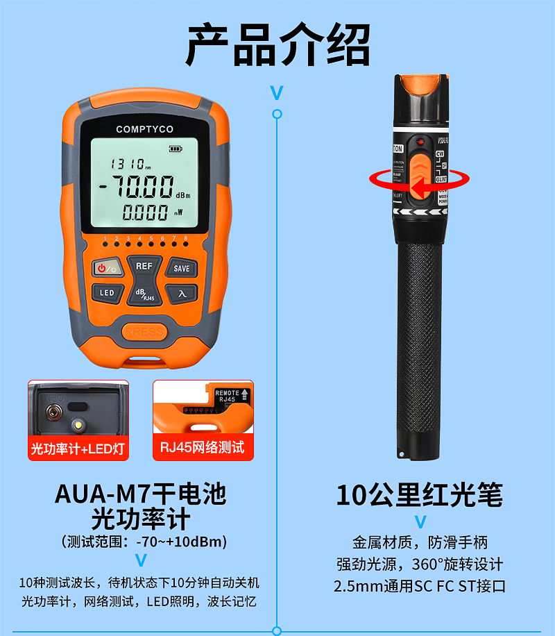 产品名称:康普泰 AUA-M7/M5迷你10波长三合一光功率计光纤冷接工具包套装 光纤切割刀剥线钳剥纤钳
