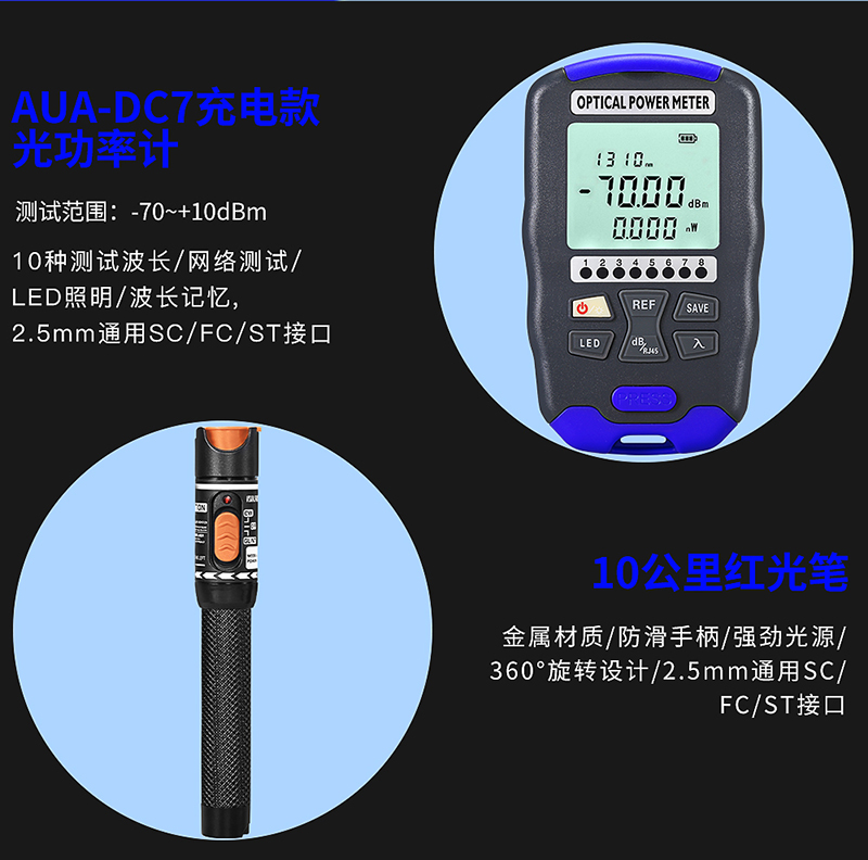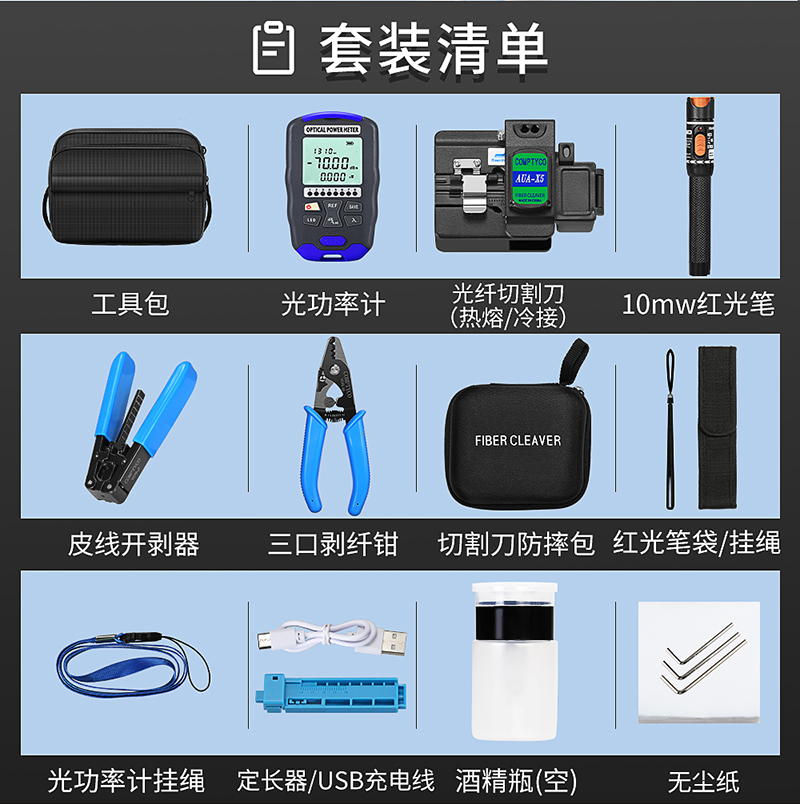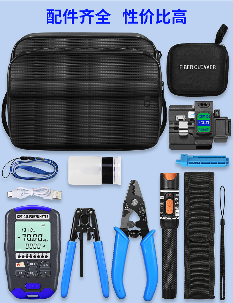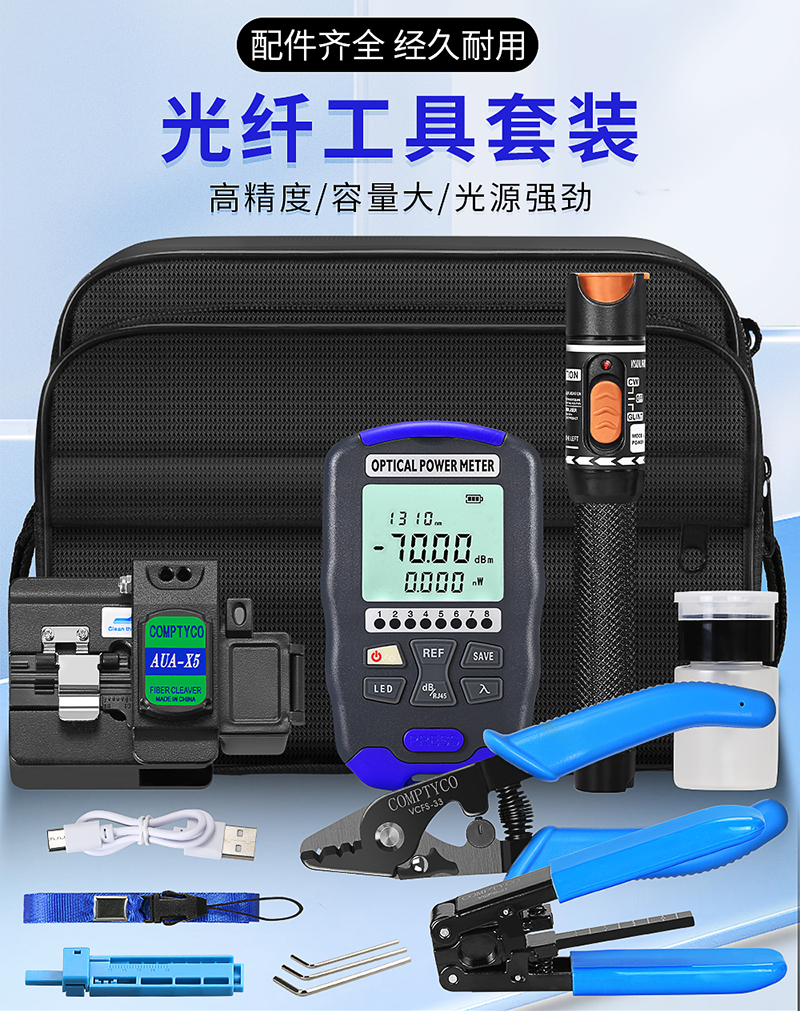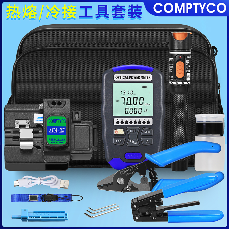 产品名称:COMPTYCO 康普泰光纤热熔冷接工具包套装 5G高精度迷你10波长三合一AUA-DC7/DC5充电光功率计 光纤切割刀剥纤钳剥线钳套装