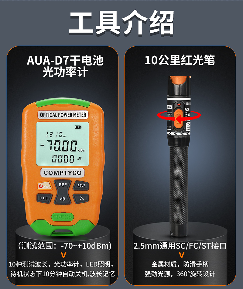产品名称:FTTH光纤冷接工具包套装AUA-7S光纤切割刀10MW红光笔迷你光功率计AUA-D7/D5可选