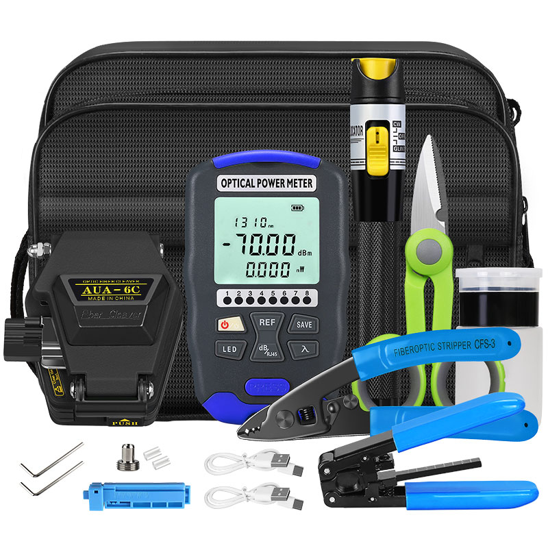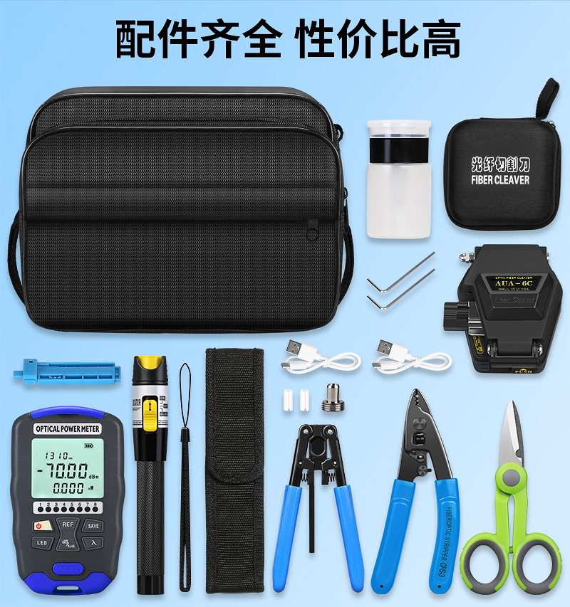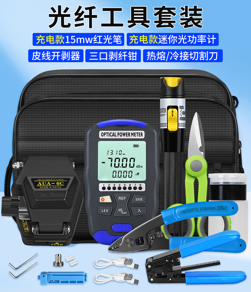 产品名称:充电款红光笔光功率计冷接热熔光纤工具套装 配套工具包光纤切割刀三口米勒钳皮线开剥器