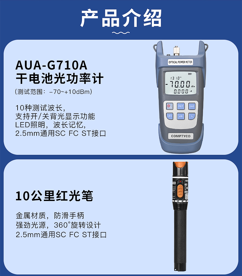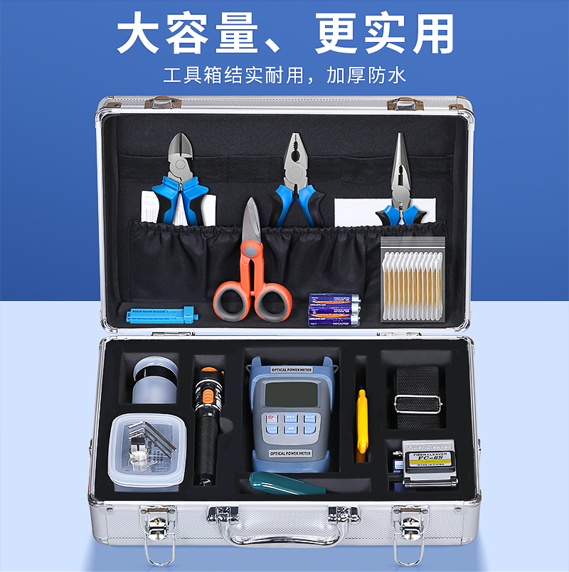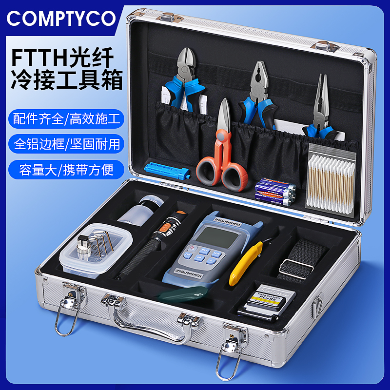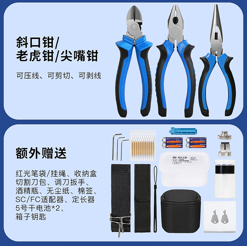 产品名称:康普泰光纤冷接工具套装 光纤维护工具箱光纤切割刀光功率计红光笔老虎/斜口/尖嘴钳米勒钳开剥酒精瓶无尘纸套装