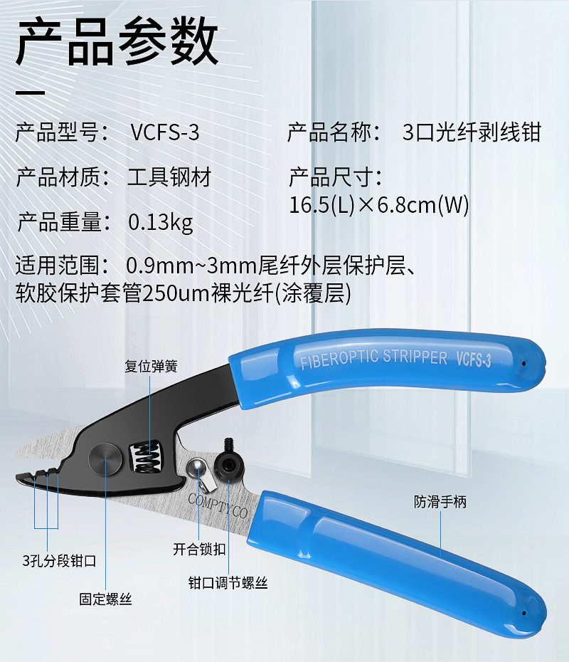 产品名称:康普泰 VCFS-3光纤剥线钳剥纤钳三口钳光纤涂覆层剥离钳