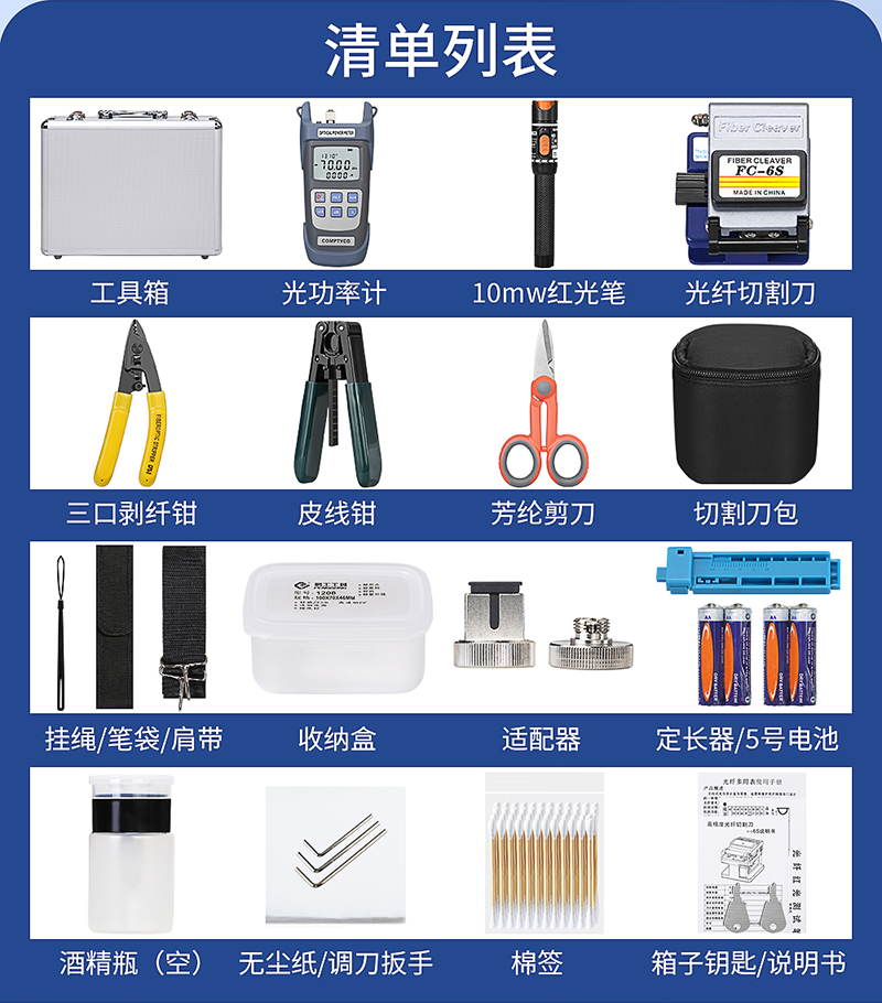 产品名称:COMPTYCO 康普泰光纤冷接工具套装 光纤维护工具箱红光笔光功率计光纤切割刀米勒钳剥线钳定长器酒精瓶套装